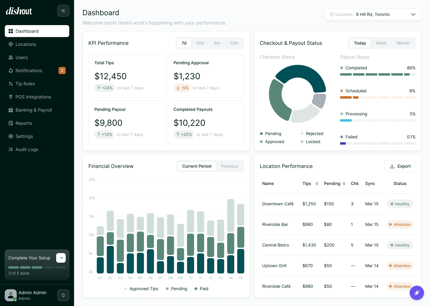 Whether you manage one restaurant or many, DishOut keeps tip logic consistent while allowing flexibility where each location needs it. Standardize operations without forcing one-size-fits-all rules.